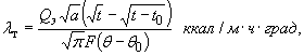 где Rэ - электрическое сопротивление нагревателя в ом; F - площадь нагревателя в контакте с одним образцом в см2. 3.63. По окончании опыта образец грунта взвешивают с точностью до 0,01 кг, а затем отбирают не менее трех проб для определения влажности грунта по ГОСТ 5179-64. Объемный вес образца определяют путем деления веса образца на его объем, устанавливаемый обмером. ОБРАБОТКА РЕЗУЛЬТАТОВ ИСПЫТАНИЯ И ОПРЕДЕЛЕНИЕ КОЭФФИЦИЕНТА ТЕПЛОПРОВОДНОСТИ 3.64. По данным испытаний коэффициент теплопроводности исследованного образца грунта определяют по формуле где Qэ = 0,86U2/Rэ - тепловая мощность нагревателя в ккал/ч; F - площадь нагревателя в контакте с одним образцом в м2;