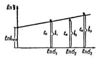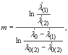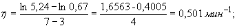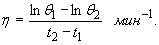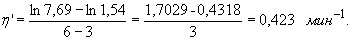 Вычисление. По двум произвольным значениям температуры, взятым на линейном участке графика изменения lnq по времени t, например для моментов времени t1 = 3 мин и t2 = 7 мин в первом опыте и для t1 = 3 мин и t2 = 6 мин во втором, вычисляют темпы охлаждения образца h и h' по формуле (47):
