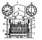нормальных где a - угол наклона образца в град; F- площадь среза в см2; Р - вертикальная нагрузка в кг. 4.196. Испытание на срез производят с образцом цилиндрической формы. При испытании на приборе ГГП-30, обычно высота образца талого грунта 50 мм, диаметр 71,4 мм (площадь 40 см2), а мерзлого грунта при той же высоте образца сокращают диаметр до 50,5 мм (площадь 20 см2). На клиновом приборе испытывают во всех случаях образец высотой 100 мм и диаметром 71,4 мм. Примечание. В тех случаях, когда высота монолита или керна не позволяет получить образец грунта указанной высоты, допустимо ее уменьшение до 35 мм при испытании на приборе типа ГГП-30 и до 95 мм при испытании на клиновом приборе. 4.197. Для определения значений сопротивлений сдвигу оттаявших грунтов текучей и мягкопластичной консистенции рекомендуют использовать одноплоскостной сдвиговой прибор ВСВ-1 системы Гидропроекта (рис. 27).
