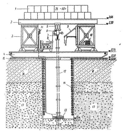 фундамента КАСАТЕЛЬНЫЕ СИЛЫ ПУЧЕНИЯ ГРУНТОВ4.274. Под морозным выпучиванием фундаментов и конструкций сооружений понимают их вертикальные смещения (поднятия), вызываемые пучением грунта при промерзании. 4.275. Силы пучения грунта по направленности их к поверхности фундамента подразделяют на касательные и нормальные. Под касательными понимают силы, направленные вдоль боковой поверхности фундамента (или конструкции сооружения), под нормальными - силы, направленные перпендикулярно боковой поверхности или подошве фундамента. 4.276. При расчетах фундаментов на вечномерзлых грунтах необходимо проверять устойчивость фундамента на действие касательных сил пучения. Для проведения расчета согласно пп. 5.14-5.21 главы СНиП II-Б.6-66 необходимо знать нормативное значение касательных сил пучения τн. Значение τн рекомендуется принимать на основании опытных данных, и лишь при отсутствии их для осредненных мерзлотногрунтовых условий допускается назначать 0,6-0,8 кг/см2, а для сложных условий - 1 кг/см2. 4.277. В зависимости от времени и сроков проведения изыскательских и проектных работ, местоположения возводимого объекта и других причин значения касательных сил пучения могут быть установлены на основании проведения полевых и лабораторных испытаний. Основным методом получения расчетных значений являются полевые испытания. Лабораторные испытания проводятся для уточнения τн, полученных в результате полевых испытаний в части оценки влияния на τн влажности грунта, температуры и других факторов. ОПРЕДЕЛЕНИЕ СУММАРНОЙ КАСАТЕЛЬНОЙ СИЛЫ ПУЧЕНИЯ ГРУНТОВ В ПОЛЕВЫХ УСЛОВИЯХ 4.278. Полевые испытания касательных сил пучения грунтов могут предусматривать решение следующих задач: а) оценка сил пучения на определенной площадке, выбранной под конкретный строительный объект; б) оценка сил пучения в качестве расчетной характеристики для района строительства в целом. 4.279. В первом случае силы пучения определяются на опытных фундаментах, аналогичных тем, которые будут заложены на проектируемом объекте. При этом искомой величиной Т, кг является результирующее значение всех сил, действующих на опытный фундамент при промерзании грунтов. По результатам определения Т проверка устойчивости проектируемого сооружения на действие касательных сил пучения производится по формуле