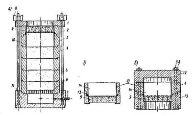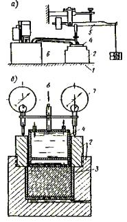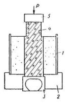 Рис. 34. Формы для изготовления образцов 4.259. Последовательность операций при приготовлении образцов должна быть следующей: предварительно высушенный и размельченный грунт доводится до требуемой влажности; затем, в зависимости от задач эксперимента, выбирается нужная форма для смораживания, в нее закладываются диск материала фундамента и металлический стакан, который заполняется грунтом. Таким образом собранную форму помещают в холодильную камеру. 4.260. Режим замораживания образцов выбирают в зависимости от задания с учетом теплового влияния сооружения. При этом следует руководствоваться формулой (10) главы СНиП II-Б.6-66. 4.261. В процессе замораживания грунта наблюдают за температурой с помощью термопар. Термопары вводят в образец грунта через отверстия в стенке металлического стакана и формы. После полного промерзания грунта образец вынимают из формы и выдерживают в ультратермостате или холодильной камере не менее 2 ч при температуре, принятой в опыте. 4.262. В качестве формы для приготовления образцов грунта может быть использована сдвиговая камера прибора НИИ оснований. Это следует делать в случаях, когда необходимо определить сопротивление сдвигу по поверхности фундамента при действии нормальных (обжимающих) усилий. В природной обстановке нормальные усилия возникают в процессе замерзания грунта, ограниченного боковой поверхностью фундамента и стенкой скважины, в которую он погружен, например при смерзании грунта со сваей в скважине, заполненной разжиженным грунтом (шламом). 4.263. Приготовление образца в приборе НИИ оснований (рис. 33) производится по следующей методике. В сдвиговую камеру устанавливают стакан-грунтонос, а в цилиндрическое углубление подвижной каретки закладывают диск материала фундамента. В собранном виде прибор устанавливают так, чтобы материал фундамента оказался под стаканом-грунтоносом. После этого стакан-грунтонос заполняют грунтом. На поверхность грунта накладывают штамп и устанавливают динамометр. Для выравнивания поверхности грунта под штампом с помощью винта грунт в течение 5 мин обжимают давлением 0,1 кг/см2. После этого прибор ставится в холодильную камеру. В процессе промерзания грунта наблюдают за показаниями динамометра, который фиксирует усилие пучения в грунте при смерзании его с материалом фундамента. После того как процесс пучения грунта закончится, прибор помещают под пресс и производят испытание на сдвиг. 4.264. Стенки стакана-грунтоноса перед заполнением грунтом следует смазать техническим вазелином или солидолом и проложить слоем полиэтиленовой пленки; поверхность штампа, соприкасающуюся с грунтом, также смазывают вазелином или солидолом. ПРОВЕДЕНИЕ ИСПЫТАНИЙ 4.265. Конечной целью испытаний является определение предельно длительного сопротивления сдвигу мерзлого грунта по материалу фундамента. 4.266. Для проведения испытаний могут быть использованы гидравлические, электромеханические и рычажные прессы и испытательные машины. Кратковременные испытания производят на гидравлических и электромеханических прессах; испытания на ползучесть - на рычажных прессах или испытательных машинах, приспособленных для поддержания постоянной нагрузки в течение длительного времени. 4.267. Величина нормальной нагрузки определяется заданием в зависимости от способа установки или погру
