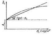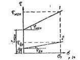 4.206. Значение условно-мгновенного сопротивления мерзлого грунта при быстром сдвиге tмгн определяют как частное от деления разрушающего усилия Тмгн на площадь среза образца F. Полученные результаты заносят в журнал (табл. 39). 4.207. По результатам испытаний образца данного грунта известной влажности и температуры строят диаграмму сдвига (рис. 29, кривая 1): по оси абсцисс откладывают значения нормального напряжения s, а по оси ординат - соответствующие значения сопротивления быстрому сдвигуtмгн.
