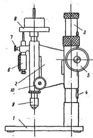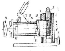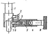27. Схема сдвигового прибора ВСВ-1 4.198. Передачу сдвигающей и нормальной нагрузок на приборе ВСВ-1 осуществляют с помощью динамометров. Для передачи нормальной нагрузки используют динамометр типа ДС-02 или ДС-1, для сдвигающей - типа ДС-02. 4.199. На неподвижную часть ножки индикатора динамометра, измеряющего напряжение сдвига, устанавливают тормозное устройство (рис. 28), фиксирующее значение максимального напряжения сдвига. Прижимной штифт тормозного устройства должен быть прижат к подвижной части ножки индикатора с достаточной силой, чтобы воспрепятствовать ее обратному ходу, но не затруднять перемещение ножки при приложении нагрузки.