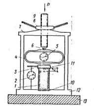 относительной деформации образца ОПРЕДЕЛЕНИЕ ПРЕДЕЛЬНО ДЛИТЕЛЬНОГО СОПРОТИВЛЕНИЯ ГРУНТА ОДНООСНОМУ СЖАТИЮ 4.173. Используя полученное значение деформации l¢к, определяют конечную нагрузку Рк в соответствии с п. 4.163, соответствующую стабилизированной деформации. 4.174. На основании полученных данных определяют значение предела длительной прочности образца грунта при сжатии sсж.дл кг/см2. Если динамометр обладает достаточно большой жесткостью, то sсж.дл = sк, где sк - значение конечного напряжения, определяемое из выражения sк = Рк /F , при этом F - площадь образца после окончания опыта в см2. 4.175. Жесткость динамометра, при которой справедливо выражение sсж.дл = sк, определяют по формуле