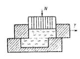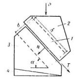 26. Схема клинового прибора В отличие от приборов ГГП-30 в клиновом приборе касательное и нормальное усилия не могут быть заданы автономно, а определяются путем расчета. 4.193. Клиновой прибор состоит из двух чугунных обойм, в которое помещают образец грунта. Нагрузку Р прикладывают вертикально. При наклонном положении образца грунта составляющие усилия Р по нормали и касательной к плоскости среза образуют нормальную N и касательную Т нагрузки. Желаемое соотношение между нормальным и касательным напряжениями получают, изменяя угол наклона образца a при помощи сменных металлических клиньев. 4.194. Испытание на клиновом приборе обычно проводят при наклоне образца от 30 до 60-70°. Нагрузку Р на образец подают гидравлическим или механическим прессом, а при испытании слабых грунтов - рычажным прессом. 4.195. Значения