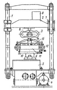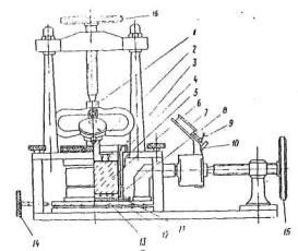 4.302. Температура, влажность (льдистость) образца грунта (заданного гранулометрического состава) и скорость его перемещения по модели фундамента, определяющие условия проведения испытании, устанавливают в соответствии с природными условиями обследуемой строительной площадки. ПРИБОРЫ 4.303. Для исследования устойчивого сопротивления сдвигу мерзлого грунта относительно модели фундамента рекомендуется применять механизированный динамометрический пресс (конструкция ЦНИИС Минтрансстроя). 4.304. Механизированный динамометрический пресс (рис. 37) состоит из двух стоек, опорной балки, измерительного устройства - динамометра, электромотора, редуктора, рабочей платформы, имеющей вертикальные перемещения с необходимой заданной скоростью.