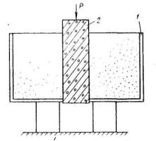 если это предусмотрено заданием, производятся для получения значений ПРИБОРЫ 4.249. Для определения сопротивления мерзлых грунтов сдвигу по боковой поверхности фундаментов лабораторным методом используют приборы, в которых через испытуемый грунт продавливаются модели фундаментов (прибор Н.А. Цытовича) или элементы фундаментов (прибор В.Ф. Ермакова), а также сдвиговые приборы, в которых сдвиг осуществляется по плоскости смерзания грунта с элементом фундамента (прибор НИИ оснований). 4.250. Прибор Н.А. Цытовича (рис. 31) состоит из наружного кольца (диаметром 105 мм, высотой 80 мм); поддона с круглым отверстием в центре; вкладыша, закрывающего отверстие в поддоне; стойки (диаметром 40 мм и высотой 120 мм), изготовленной из различного строительного материала; наголовника, надеваемого на стойку.