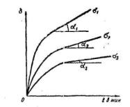 Рис. 39. Зависимость относительной деформации льда d от времени t при различных значениях напряжения (s1 > s2 > s3) 4.345. На каждой из кривых ползучести выделяют линейный участок, соответствующий течению с постоянной скоростью (рис. 39). Затем определяют установившуюся скорость относительной деформации vотi = const, численно равную тангенсу угла наклона линейного участка каждой из кривых ползучести к оси абсцисс (времени), т. е. получают ряд скоростей vот1 = tga1; vот2 = tga2 и т. д. по числу опытов. Эти значения должны совпадать со значениями относительной скорости vотi, вычисленными по формуле (89). 4.346. Для определения параметров п и Кл строится график, по оси ординат которого откладывается логарифм установившейся скорости относительной деформации x, пересчитанной в 1/ч, а по оси абсцисс - логарифм соответствующего этой скорости напряжения s (рис. 40).