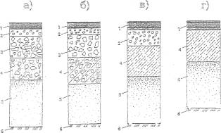 Рис. 1.2. Типовые конструкции дорожных одежд для городских улиц: а) на двухслойных основаниях из крупнозернистого асфальтобетона и известнякового щебня; б) из крупнозернистого асфальтобетона и тощего бетона; в, г) на однослойных основаниях из монолитного бетона. 1 - верхний слой покрытия; 2 - нижний слой покрытия; 3 - верхний слой основания; 4 - основание; 5 - дополнительный слой основания; 6-грунт земляного полотна. Покрытие непосредственно воспринимает вертикальные и горизонтальные нагрузки от автомобильного транспорта и подвергается воздействию атмосферных факторов. Оно должно быть износо- и термостойким, водопроницаемым, ровным и шероховатым. Поэтому покрытия строят из прочных материалов. Для снижения расхода дорожно-строительных материалов применяют покрытия, состоящие из двух слоев. Нижний слой 2, непосредственно не подверженный воздействию колес автомобилей, строят из менее прочных материалов, чем верхний слой 1. Основание 4 воспринимает нагрузку, передаваемую через покрытие, и распределяет ее по земляному полотну. Благодаря этому в дорожной одежде не накапливаются остаточные деформации, которые могут вызвать местные разрушения и неровности покрытия. Основание может состоять из одного или двух слоев. Для строительства основания используют материалы с меньшей прочностью, чем прочность материалов покрытия. Однако влага, перемещающаяся из земляного полотна в период зимнего промерзания, может переувлажнять основание. Поэтому к материалам предъявляют повышенные требования в отношении водо- и морозостойкости. Дополнительный слой 5 оснований предназначен для дальнейшего распределения нагрузки (в этом случае он называется подстилающим); для отвода избыточной воды, поступающей из верхних слоев земляного полотна (дренирующий слой); для предохранения дорожной одежды от разрушения в случае пучения грунта под воздействием мороза (морозозащитный слой). Толщина слоев дорожных одежд для улично-дорожной сети Москвы указаны в типовых решениях, разработанных институтом "Мосинжпроект" и ГУП "НИИ Мосстрой" [7]. На проезжей части магистральных дорог и улиц толщина верхнего слоя покрытия принимается не ниже 5 см. нижнего слоя - не ниже 7 см; объектах местного значения - соответственно 4 и 6 см. На тротуарах, рассчитанных, кроме нагрузки от пешеходов, на заезд уборочных машин, толщина верхнего слоя покрытия из песчаного асфальта находится в пределах 3-4 см, нижнего слоя 4-6 см. В соответствии с рекомендациями ГУП "НИИ Мосстрой" [20] тип и марку асфальтобетона дорожных покрытий назначают по табл. 1.6, На тротуарах предусмотрена укладка песчаных асфальтобетонных смесей. Толщина основания из крупнозернистого пористого асфальтобетона может достигать 16 см, тощего (укатываемого) бетона класса В - 7,5-18 см, монолитного бетона класса В 30-22 см, щебня марки не менее "400" - 15 см. Толщина песчаного дополнительного слоя зависит от грунтово-гидрологических условий и устанавливается расчетом. Бортовой камень на дорожных одеждах с щебеночным основанием обязательно устанавливается на основании из бетона В 15 толщиной не менее 10 см (рис. 1.3). На бетонных основаниях дорожных одежд допускается только укладка выравнивающего слоя из цементобетонной смеси. Таблица 1.6 Рекомендуемая область применения асфальтобетонных смесей с учетом принятой классификаций улично-доро