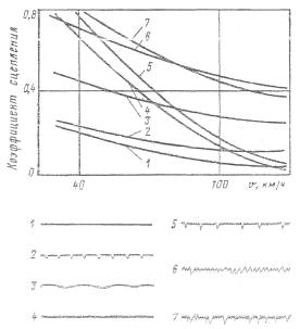 Рис. 1.3. Узлы сопряжения бортового камня с дорожной одеждой: а - прямой рядовой (БР); б - выездной (БВ); в - прямой газонный (ПГ); 1 - бетон класса В 3,5-5; 2 - отметка проезжей части; 3 - бетон класса не ниже В 27,5; 4 - отметка тротуара; 5 - отметка покрытия внутриквартальной территории; 6 - отметка газона на поверхности сквера. 2. Требования к эксплуатационному состоянию дорожных покрытийОсновные показатели транспортно-эксплуатационного состояния улично-дорожной сети (безопасность и непрерывность движения, скорость и пропускная способность) непрерывно изменяются в процессе эксплуатации под воздействием транспортной нагрузки и природно-климатических факторов. В значительной степени эти показатели зависят от объективности назначения и качества проведения мероприятий по ремонту и содержанию дорожных покрытий. 2.1. Дефекты и причины снижения эксплуатационных свойств асфальтобетонных дорожных покрытийУсловия эксплуатации дорожных одежд в городах существенно отличаются от условий эксплуатации на внегородских автомобильных дорогах. Здесь выше интенсивность движения (хотя и ниже средняя скорость). Наличие люков, водоприемных сооружений, вынужденные многочисленные разрытия проезжей части, особенно на исторически сложившейся сети улиц, создают повышенные динамические воздействия на дорожные одежды. В условиях городов вследствие многочисленных торможений автотранспорта у светофоров, на нерегулируемых перекрестках, остановках пассажирского транспорта часто возникают сдвиговые деформации. Наиболее распространенными дефектами асфальтобетонных покрытий являются износ, шелушение, выкрашивание, выбоины, трещины, сдвиги и волны (дефекты в целом дорожных одежд - просадки, проломы, разрушения кромок, колейность, в настоящем "Руководстве" не рассматриваются). Износ покрытия происходит под воздействием касательных напряжений от движущегося транспорта, особенно при его торможении. Износ от грузовых автомобилей примерно в 2 раза больше в сравнении с легковыми. На магистралях с интенсивным движением автомобилей покрытие шлифуется и даже истирается. В этом случае снижается прочность дорожкой одежды, уменьшается шероховатость, и покрытие, (особенно влажное) становится скользким, что вызывает дорожно-транспортные происшествия. Из графика на рис. 2.1 видно, как изменяется один из основных показателей безопасности движения - коэффициент сцепления в зависимости от степени и вида шероховатости и скорости движения. При минимально допустимом значении коэффициента сцепления 0,30 [9] поверхности - гладкая 1 с отдельными углублениями 2 и волнистая 3 - не обеспечивают требуемых сцепных свойств. Для движения со скоростью до 60-70 км/час допустимы поверхности с малой шероховатостью 4 и 5 с небольшими выступами шероховатости. Для таких слоев применяют мелкозернистый минеральный материал типа крупного песка или острогранных высевок размером 3-8 и 5-10 мм.