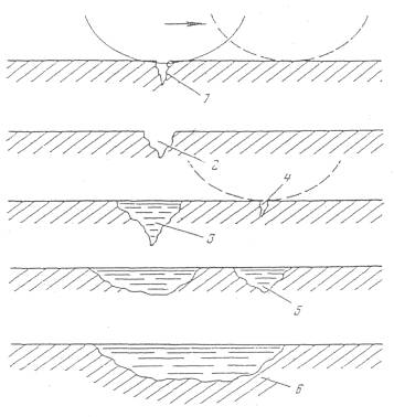 Рис. 2.3. Динамика развития выбоин на покрытии: 1, 2 - трещины или раковины при выкрашивании; 3 - расклинивающее действие воды и льда и образование трещины в зоне повторного удара; 4 - вторичный удар колеса; 5, 6 - объединение смежных выбоин. Другой разновидностью поперечных трещин являются сквозные (на всю ширину покрытия) температурные трещины (рис. 2.4). Эти трещины возникают в холодные периоды года вследствие резких перепадов температуры и недостаточной сопротивляемости асфальтобетона растягивающим усилиям. В начальной стадии образования температурных трещин интервал между ними составляет 25-30 м, в последствие, по мере старения вяжущего в асфальтобетоне, сокращается в 2-3 раза.