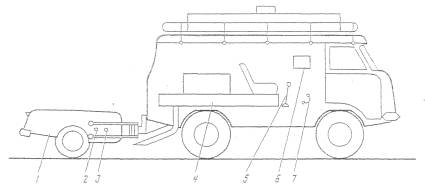 Рис. 2.5. Лаборатория КП-511 для оценки ровности и коэффициента сцепления: 1 - прицеп ПКРС-2У; 2 - датчик сцепления; 3 - датчик ровности; 4 - бак для воды; 5 - ручка управления поливом; 6 - блок записи измерений; 7 - педаль тормоза. Выборочный контроль сцепных свойств покрытия осуществляют переносным прибором ППК-МАДИ-ВНИИБД (рис. 2.6), предназначенным для оперативного измерения коэффициента сцепления дорожных покрытий. Прибор устанавливают на оцениваемое покрытие таким образом, чтобы его имитаторы возвышались над поверхностью на 10-12 мм. Затем покрытие под имитатором увлажняют и при помощи сбрасывающего устройства сбрасывают груз. Коэффициент сцепления фиксируется на шкале при помощи измерительной шайбы. На одном месте должно быть проведено не менее пяти измерений коэффициента сцепления. За окончательное значение принимается среднее арифметическое результатов всех измерений. На объектах федеральной дорожной сети для оперативного непрерывного контроля с адресной фиксацией дефектов (табл. 2.3) используется мобильная видеолаборатория производства НПО "Регион". Оборудование лаборатории (рис. 2.7) позволяет фиксировать дефекты и разрушения со скоростью до 40-60 км/ч по ширине покрытия 7-12 м (2-3 полосы движения).