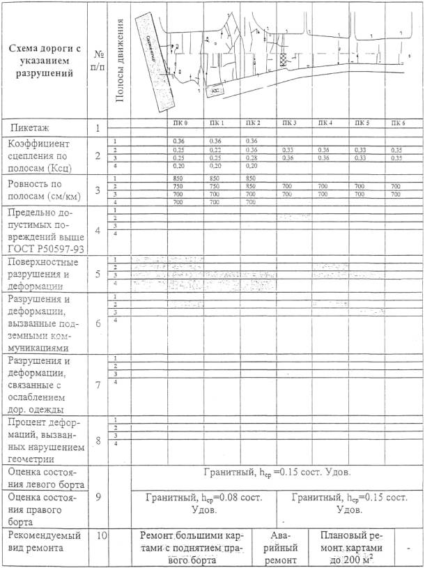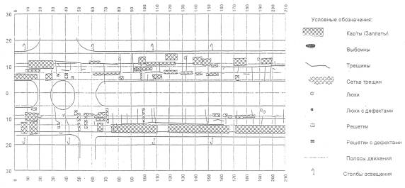Рис. 2.8. Фрагмент схематического плана поврежденности дорожного покрытия. Выборочная оценка может производиться визуальным осмотром при проезде по дороге на автомобиле со скоростью не более 10-15 км/час. Повреждения регистрируются вручную с привязкой к пройденному пути автомобиля лаборатории, при этом фиксируется полоса движения, местоположение одиночных повреждений или начало и конец участка со сплошными повреждениями данного типа. Оценка степени поврежденности покрытия для последующего назначения требуемых видов ремонтных работ проводится по следующей методике: 1. По результатам обследования, выполненного раздельно по каждой полосе движения, объект разбивается на однородные участки по следующим критериям: - однородность конструкции дорожной одежды; - год строительства, реконструкции или ремонта участка дороги; - размер интенсивности движения (одна группа); - примерно одинаковый объем однотипных повреждений и степень их развития. 2. Показатели по однородным участкам заносят в соответствующие разделы дефектной ведомости (рис. 2.9). При необходимости набора статистических данных для участков дорог с разнотипными разрушениями может быть определен их суммарный объем в %-ном отношении: S = [(Lдеф + К × N) / Lобщ] × 100%, где: S - суммарный объем разрушений, %; Lдеф - общая протяженность сплошных дефектов на полосе; N - число одиночных дефектов на полосе; К - размерный коэффициент влияния одиночного дефекта на скорость движения автомобиля (К=0,02 км); Lобщ - протяженность однородного участка. 2.3. Назначение объемов ремонтных работПо результатам обследования состояния дорожного покрытия назначают Минимальная протяженность однородного участка зависит от технологии проведения ремонтных работ: - 200-300 м для ремонтов большими картами; - 50-100 м для ремонтов обычными картами и аварийных ремонтов; - 300-800 м для капитальных ремонтов. В связи с особенностями назначения ремонтных работ дефекты и повреждения необходимо классифицировать следующим образом: 1. Поверхностные разрушения и деформации покрытия, не связанные с потерей прочности конструкции дорожкой одежды. 2. Разрушения и деформации покрытия, вызванные недостаточной прочностью конструкции дорожной одежды. 3. Деформации покрытия вызванные разрешениями подземных коммуникаций. 4. Дефекты покрытия, связанные с нарушением геометрии поверхности проезжей части. Заполнение графы 10 - "Рекомендуемый вид ремонта" - производится следующим образом: Анализируются соответствие значений показателей в графах 2-4 их предельно допустимым значениям, сочетания дефектов и разрушений, указанные в графах 5-9. В том случае, если показатели не превышают предельно допустимые, в графе 10 ставится прочерк. Наличие дефектов и разрушений, указанных в графах 7 и 8, является основанием для рекомендаций по назначению целевых обследований по установлению причин их возникновения. В случае превышения предельных значений показателей в графах 2-4 или дефектов и разрушений в графах 5, 6 назначаются конкретные виды ремонта, выделяются участки, требующие первоочередного ремонта, и рассчитываются объемы работ. При использовании мобильной лаборатории, наряду с дефектовкой дорожного покрытия, могут быть решены задачи раздельного подсчета объемов работ по всем операциям. В качестве примера на рис. 2.10-2.12 приведена последовательность: 