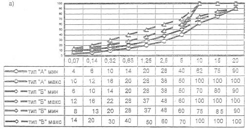 Рис. 3.1. Зерновые составы минеральной части асфальтобетонных смесей: а - мелкозернистых непрерывного состава; б - мелкозернистых прерывистого состава; в - песчаных. На горизонтальных осях графиков указаны, размеры зерен минерального материала, мм, на вертикальных - массовая доля частиц мельче данного размера, %. Песчаные плотные асфальтобетонные смеси типа Г подразделяют на три марки (I, II, III), а типа Д - на две (II и III). Для приготовления асфальтобетонных смесей типа Г марок I и II используют дробленый песок и отсевы продуктов дробления изверженных пород, прочность на сжатие которых не ниже 100 МПа для марки I и 80 МПа - для марки II. Асфальтобетонные смеси марки III приготовляют из горных пород прочностью не менее 60 МПа. Минеральный порошок для приготовления плотных горячих асфальтобетонных смесей получают помолом известняка прочностью 50-60 МПа. В асфальтобетонных смесях марок II и III допустимо применение минерального порошка, получаемого помолом основных металлургических шлаков, а в смесях марки III - порошковых отходов промышленности. В качестве вяжущего материала, используемого в смесях, укладываемых в Москве, применяют вязкие битумы типов БНД 60/90 и БНД 90/130 по ГОСТ 22245-90. Рекомендуемое содержание битума (% по массе) в высокоплотных смесях - 4,0-6,0; смесях типов А - 4,5-6,0; Б - 5,0-6,5; В - 6,0-7,0; Г и Д - 6,0-9,0. При использовании более вязких битумов возрастает прочность и жесткость асфальтобетонных покрытий, менее вязкие битумы увеличивают устойчивость покрытий при низкой температуре. Введение в битум полимеров (дивинилстирольных или бутадиенстирольных термоэластопластов) и пластификаторов позволяет получить полимерно-битумное вяжущее (ПБВ), стабилизирующее физико-механические свойства асфальтобетона при сезонных перепадах температуры. Полимерно-битумные вяжущие для асфальтобетонных смесей должны соответствовать требованиям ОСТ 218.010-98. Вяжущие полимерно-битумные дорожные на основе блоксополимеров типа СБС В табл. 3.1 и 3.2 приведены показатели свойств асфальтобетонов верхних слоев дорожных покрытий для климатических условий г. Москвы. Пористость минеральной части асфальтобетонов должна быть не более: высокоплотных - 16 %, плотных типов: А и Б - 19 %; В, Г и Д - 22 %. Для проверки соответствия качества смесей требованиям стандарта [10] проводят приемосдаточные и периодические испытания. При приемосдаточных испытаниях отбирают в соответствии с ГОСТ 12801-84 одну пробу от партии (партией считают количество смеси одного состава, выпускаемое на одной установке в течение смены, но не более 600 т) и определяют: температуру смеси, зерновой состав минеральной части, водонасыщение, прочность при сжатии при температуре 50, 20 °С и водостойкость. Периодический контроль, осуществляемый не реже одного раза в месяц, а также при изменении материалов, включает: определение пористости минеральной части, остаточной пористости, водостойкости при длительном водонасыщении, прочности при температуре 0 °С, сцепление битума с минеральной частью смесей. Таблица 3.1 Физико-механические свойства высокоплотных и плотных асфальтобетонов