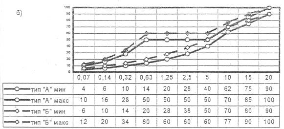 Рис. 2.12. Оптимизация объемов подготовительных работ. 3. Дорожно-строительные и ремонтные материалы и полуфабрикаты3.1. Горячие асфальтобетонные смесиАсфальтобетонная смесь - материал, получаемый в результате смешивания в асфальтосмесительных установках в нагретом состоянии щебня (гравия), природного или дробленого песка, минерального порошка и нефтяного дорожного битума, взятых в определенных соотношениях. Уплотненную асфальтобетонную смесь называют асфальтобетоном. Асфальтобетонную смесь в зависимости от вязкости битума и температуры укладки подразделяют на горячую, теплую и холодную. В настоящее время при строительстве и ремонте городских дорог и улиц теплые и холодные смеси практически не применяют. Поэтому в данном разделе будут рассмотрены только горячие смеси, которые готовят на вязких битумах и укладывают при температуре не ниже 120 °С [10]. Формирование структуры асфальтобетона в основном заканчивается в период его уплотнения самоходными дорожными катками. Горячие асфальтобетонные смеси подразделяют по предельной крупности на крупнозернистые (до 40 мм), мелкозернистые (до 20 мм) и песчаные (до 5 мм). В зависимости от массовой доли щебня или песка различают пять типов асфальтобетонных смесей: тип А с массовой долей щебня 50-60 %, тип Б - 40-50 %; тип В - 30-40 %; тип Г - на песках из отсевов дробления, а также на смесях с природным песком при содержании последнего не более 30 % по массе и тип Д - на природных песках или смесях природных песков с отсевами дробления при массовой доле последних менее 70 %. Зерновые составы основных типов мелкозернистых и песчаных смесей приведены на рис. 3.1. Асфальтобетоны подразделяют на высокоплотные с остаточной пористостью 1,0-2,5 %, плотные - 2,5-5 %, пористые - 5,0-10,0 % и высокопористые - 10,0-18,0 %; причем пористые и высокопористые смеси применяют только в нижних слоях покрытий и в основаниях. Для приготовления плотных горячих асфальтобетонных смесей I марки типов А и Б применяют щебень марки 1200. В смесях типа Б можно также использовать щебень из гравия марки 1000. В состав асфальтобетонных смесей типа В может входить щебень марки 1000 из изверженных и метаморфических пород. Эти же материалы применяют и для приготовления асфальтобетонных смесей типа Б II марки. В состав асфальтобетонной смеси II марки может входить щебень из менее прочных каменных пород. Так, в асфальтобетонных смесях типа А применяют щебень марки 1000, а в асфальтобетонных смесях типа В допускается использовать щебень из изверженных пород марки 800. К асфальтобетонным смесям III марки относятся щебеночные асфальтобетоны типов Б и В, в состав которых входит щебень, марка которого на 200 единиц ниже, чем для смесей марки II. Для приготовления асфальтобетонных смесей марок I и II применяют природный и дробленый песок с модулем крупности М - больше 2, а марки III с М меньше 2. Дробленый песок для смесей марки I получают дроблением горной породы, прочность на сжатие которой не менее 80 МПа, для смесей марки II - 60 МПа, марки III - 40 МПа. Песок получают также дроблением гравия марок Др 12, Др 16, Др 24 соответственно для смесей марок I, II и III.
