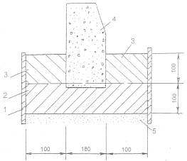 Рис. 4.2. Схема установки бортового камня: 1 - опалубка; 2 - бетонное основание под бортовой камень; 3 - участок до бетонирования; 4 - бортовой камень; 5 - песчаный подстилающий слой.