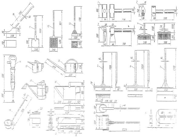Рис. 4.8. Ручной инструмент, используемый при укладке асфальтобетонных смесей. 4.4 Уплотнение асфальтобетонной смесиУплотнение асфальтобетонной смеси - основная технологическая операция, которая предопределяет физико-механические свойства покрытия. Недостаточное уплотнение асфальтобетонного покрытия - одна из основных причин его разрушения. Так, обследованием причин повреждения асфальтобетонных покрытий установлено, что 50 % всех разрушений объясняется недостаточным уплотнением. В процессе уплотнения при последовательных проходах катка смесь деформируется за счет уменьшения пористости, т.е. уменьшения объема уплотняемого слоя. При этом происходит формирование структуры асфальтобетонного покрытия. В процессе уплотнения необходимо обеспечить такую степень плотности, при которой полностью исключается доуплотнение покрытия под воздействием автомобильного транспорта. Кроме того, при уплотнении должно быть обеспечено полное закрытие пор на поверхности покрытия, что препятствует поступлению в него воды. На уплотняемость асфальтобетонных смесей оказывают влияние форма, шероховатость и количество щебня в смеси. Дробленые зерна с шероховатой поверхностью значительно повышают сопротивляемость асфальтобетона уплотнению, причем особенно это относится к дробленому песку. Поэтому в зависимости от перечисленных факторов, а также марки применяемого битума в смеси, ее вида и типа, толщины укладываемого слоя определяют состав уплотняющих средств и их технологический режим работы. Уплотнение асфальтобетонных покрытий осуществляется тремя методами: укаткой, трамбованием и вибрацией. Для реализации этих методов созданы уплотняющие машины с гладкими металлическими вальцами, на пневматических шинах (метод укатки), трамбующие машины - оборудование асфальтоукладчиков (метод трамбования), вибрационные (метод вибрации). Укатка - перекатывание металлического барабана или пневматического колеса по уплотняемой поверхности. В результате воздействия массы катка уплотняемый материал приобретает остаточную деформацию. Эта деформация по мере увеличения плотности будет уменьшаться и к концу укатки приблизится к нулю. Дальнейшее увеличение плотности материала может быть достигнуто лишь увеличением нагрузки на вальцы. Трамбование заключается в периодическом поднятии и свободном падении с определенной высоты на уплотняемый материал массивного тела. Вибрирование основано на передаче уплотняемому материалу колебаний, близких по частоте собственным колебаниям уплотняемого материала. Степень уплотнения асфальтобетонной смеси зависит от веса и типа уплотняющих средств, а также от числа их проходов по одному следу и характеризуется значением коэффициента уплотнения, который определяется как отношение плотности материала, взятого из покрытия, к плотности эталонного образца. Коэффициент уплотнения должен быть равен: для мелкозернистых смесей с содержанием щебня 40 % и более (типы А и Б) - не менее 0,99; для мелкозернистых смесей с содержанием щебня 30-40 % (тип В), песчаных смесей (типы Г и Д) и крупнозернистых смесей для нижнего слоя покрытия - не менее 0,98. В процессе укатки обеспечивают такую максимальную степень уплотнения асфальтобетонной смеси, при которой полностью исключается доуплотнение покрытий под воздействием транспорт