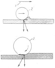 Рис. 4.13. Воздействие ведущего и ведомого вальцов на уплотняемый слой: 1 - направление движения катка; 2 - воздействие ведомого вальца; 3 - воздействие ведущего вальца. В отличие от катков с гладкими вальцами в катках на пневмоколесах отмечается постоянная поверхность контакта (диаметром 30 см) уже после первых проходов. Поэтому оптимальная толщина уплотняемого слоя у них остается постоянной и более высокой, чем у катков с гладкими вальцами, если только давление достаточно, чтобы уплотнить весь слой (рис. 4.11). Внешнее давление должно превышать внутреннее сопротивление материала, как в начальный период уплотнения, так и при дальнейшем нарастании прочности слоя. В случае остывания органических вяжущих эффект действия катков на пневмоколесах не уменьшится, если повысить давление в шинах. В процессе уплотнения за счет усилий сжатия, направленных перпендикулярно "пятну" контакта, достигается наилучшее уплотнение асфальтобетона. Этому способствует также наличие на одной оси нескольких колес на небольшом расстоянии одно от другого, что обеспечивает перемещение материала в зоны между колесами, создавая повышенную уплотняемость смеси. Катки на пневматических колесах особенно эффективны при уплотнении асфальтобетонных смесей с высоким содержанием щебня, так как снижается вероятность дробления зерен щебня в смеси. Метод вибрационного уплотнения получил широкое распространение, так как применение вибрации обеспечивает высокую степень уплотнения. Вибрационный метод уплотнения крайне эффективен при необходимости интенсивного уплотнения в короткие сроки, а также при пониженной температуре воздуха: виброкатки уплотняют асфальтобетонные покрытия при сравнительно небольшом количестве проходов. Мощность катка высока, и во многих случаях один виброкаток может заменить два и более катков статического действия. Однако, как и в случае применения катков статического действия с гладкими металлическими вальцами, толщина уплотняемого слоя обусловлена размером площади давления. Комбинированные катки сочетают преимущества и возможности катков на пневмоколесах и вибрационных. Уплотнять смеси начинают непосредственно после их распределения при температуре, при которой давление от катка не превышает сопротивления сдвигу уплотняемого слоя при определенной длительности нагружения. Рекомендуемая температура (°С) для эффективного уплотнения смесей приведена в табл. 4.7. Как видно из приведенной таблицы температурный интервал каждого этапа уплотнения примерно одинаков и оставляет в среднем около 20 °С, но по продолжительности этапы сильно отличаются друг от друга из-за различной скорости остывания смеси сразу после ее раскладки в покрытие и в конце укатки. Ориентировочное время остывания смеси от начала до конца ее уплотнения катками можно определить по формуле: t = 2 √h3(T0 - Т)/(1 + 0,1Vв)(Т - Тв), мин, где: h - толщина слоя смеси в рыхлом состоянии, см: Т0 - температура смеси в покрытии сразу после укладчика, °С; Т - температура смеси в момент окончания укатки, °С; Тв - температура наружного воздуха (основания) при укатке, °С; Vв - скорость ветра во время уплотнения смеси, м/с. Таблица 4. 7 Температурные интервалы этапов уплотнения