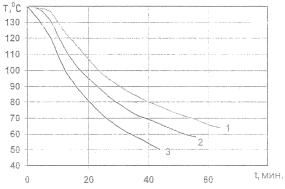 Примечание. Температура начала укатки на последующем этапе соответствует окончанию работ на предыдущем этапе. Можно пользоваться также графиком на рис. 4.14, построенным для слоя 5 см в плотном теле (в рыхлом около 6-6,5 см) по экспериментальным замерам температуры. Общее время охлаждения различных слоев смеси от 140-135 °С до 65-60 °С при определенных погодных условиях составит от 15 до 100 мин. В рамках этого времени необходимо выполнить весь объем работы по уплотнению. Таблица 4.8 Временные интервалы уплотнения асфальтобетонных смесей