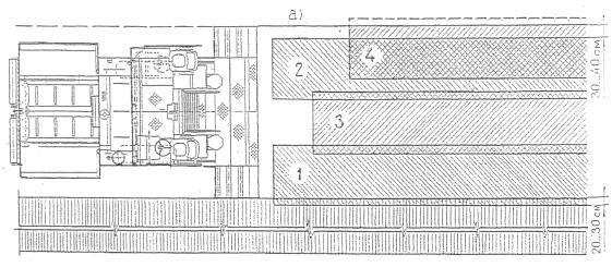 Рис. 4.10. Конструкция уплотняющего рабочего органа асфальтоукладчика с высокой степенью уплотнения: 1 - трамбующий брус; 2 - вибрационный брус; 3 - прессующие планки; 4 - вибрационный плавающий брус. При использовании асфальтоукладчиков с уплотняющими рабочими органами, создающими высокую степень уплотнения, не требуется уплотнения укаткой смесей типов В и Д, а смеси других типов уплотняют сразу тяжелыми катками. Предварительное уплотнение легкими катками может начинаться при достаточно высокой температуре смеси. Однако при остановке асфальтоукладчика по различным причинам непосредственно позади него остается неукатанная, недоступная для работы катков полоса. Катки с гладкими металлическими вальцами передают давление на уплотняемую смесь через площадку шириной ас (рис. 4.11). При повторных проходах катка деформации асфальтобетона постепенно уменьшаются вследствие повышения плотности и жесткости уплотняемого слоя. Это, в свою очередь, приводит к уменьшению ширины площади воздействия вальца на уплотняемый материал: для легких катков - 6-4, средних- 7-5 и тяжелых - 10-6 см. С уменьшением ширины площадки снижается глубина распределения уплотняющего напряжения σ, которая практически равна ширине площадки ас. Напряжение σ можно увеличить, применяя для уплотнения каток большей массы. Поэтому уплотнение начинают легкими катками, когда уплотняющее давление по толщине слоя достаточно высокое. По мере уменьшения этого давления включают в работу средние и тяжелые катки. Толщина уплотняемого слоя в зависимости от типа катка находится в пределах: для легких катков - 6-7 см; средних катков - 8-9 см; тяжелых катков - 10-12 см.