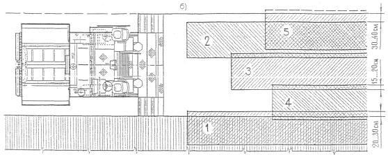Примечания. В условиях реконструкции допускается уменьшать ширину разделительных полос между основной проезжей частью и местным проездом на магистральных улицах общегородского значения до 2 м, между проезжей частью и крайним рельсом трамвайного пути до 2,8 м - на прямом участке и 3,1 м - на криволинейных участках радиусом не менее 250 м. В условиях сложившейся застройки Москвы допускается уменьшать ширину центральной разделительной полосы на магистральных улицах общегородского значения до 2 м с обязательной установкой на ней барьерного ограждения. Переход от 2-3-метровой ширины центральной разделительной полосы к ширине полосы 4 м следует осуществлять на участке длиной не менее 100 м. При размещении на центральной разделительной полосе опор информационных указателей и мачт освещения ширина проезжей части должна быть увеличена до 5,5 м. В конце проезжих частей тупиковых улиц устраивают площадки для разворота автомобилей с учетом обеспечения радиуса разворота 12-15 м. На отстойно-разворотных площадках для автобусов и троллейбусов должен быть обеспечен радиусом разворота 15 м. Использование разворотных площадок для стоянки автомобилей не допускается. Для обеспечения подъездов к группам жилых зданий и объектов, а также к отдельным зданиям в кварталах предусматривают основные и второстепенные проезды. Ширину проезжих частей основных проездов принимают 6,0 м, второстепенных проездов - 5,5 м, ширину тротуаров назначают 1,5 м. Для подъезда к отдельно стоящим трансформаторным подстанциям, газораспределительным пунктам, участкам школ и детских садов назначают проезды с шириной проезжей части 3,5 м. Тупиковые проезды к отдельно стоящим зданиям имеют протяженность не более 150 м и заканчиваются разворотными площадками размером в плане 12×12 м или кольцом с радиусом по оси улиц не менее 10 м. Проезжую часть на прямолинейных участках улиц с односторонним движением и шириной до 15 м, как правило, устраивают с односкатным поперечным профилем. Проезжую часть на прямолинейных участках улиц всех категорий при двустороннем движении транспорта и, как правило, с четным количеством полос, а также на кривых в плане радиусом 800 м и более для магистральных улиц общегородского значения с непрерывным движением и радиусом 600 м и более для магистральных улиц с регулируемым движением предусматривают с двускатным поперечным профилем. Поперечный уклон проезжей части (кроме участков кривых в плане, на которых следует предусматривать устройство виражей) назначают одинаковыми по всей ширине проезжей части, равный 20 ‰. Минимальный поперечный уклон на магистралях и улицах города принимают 10 ‰, максимальный - 30 ‰. Поперечные уклоны элементов поперечного сечения улиц принимают: на тротуарах основной - 20 ‰, минимальный - 5 ‰, максимальный - 30 ‰; на газонах основной - 10 ‰, минимальный - 5 ‰, максимальный - 50 ‰. 1.3. Конструкции дорожных одежд с асфальтобетонным покрытиемДорожная одежда с асфальтобетонным покрытием (рис. 1.2), как правило, состоит из собственно покрытия, основания и дополнительного слоя 5 основания.