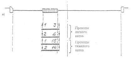 Рис. 4.15. Последовательность проходов катков по слою, уложенному на всю ширину проезжей части при отсутствии бортового камня.