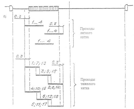 Рис. 4.16. Схемы уплотнения смесей различных типов при их распределении двумя полосами при отсутствии бортового камня: а - жесткие смеси (типы А и Б ); б - пластичные смеси (типы В, Г и Д). Последовательность проходов катков при текущем ремонте картами до 200 м2 указана на рис. 4.17. В процессе работ по уплотнению запрещается останавливать катки на свежеуложенной карте, производить повороты на уплотняемой карте, останавливать катки на свежеуложенном покрытии карты по окончании работ. Для изменения направления движения катки следует выводить за пределы карты. В местах, недоступных уплотнению катками (у бортовых камней), смесь уплотняют виброплитой (с перекрытием поверхности на 1/3 ширины пор), пока после проходов виброплиты не останется заметного следа. По окончании укладки, или при вынужденных перерывах в работе, при уплотнении в концах уложенной полосы необходимо следить за тем, чтобы катки заходили на брус, установленный поперек проезжей части. В процессе уплотнения покрытия запрещается: - заправлять катки и асфальтоукладчики на свежеуложенном и перекрываемом асфальтобетонном покрытии. Для заправки следует выводить механизмы на обочины, боковые выезды или воротные заезды; - останавливать катки на свежеуложенном покрытии. В случае аварийной остановки принять срочные меры к выводу катка из зоны работ; - переключать скорости при резком торможении на уплотненном покрытии; - производить повороты на неуплотненном покрытии. Для изменения направления движения катки следует выводить на уплотненную часть покрытия; - оставлять катки на свежеуложенном покрытии по окончании работ. Для предотвращения прилипания асфальтобетонной смеси к вальцам катка, их необходимо смачивать водой или водным однопроцентным раствором отходов мыловаренной промышленности. Не разрешается применять для этих целей соляровое масло и топочный мазут.