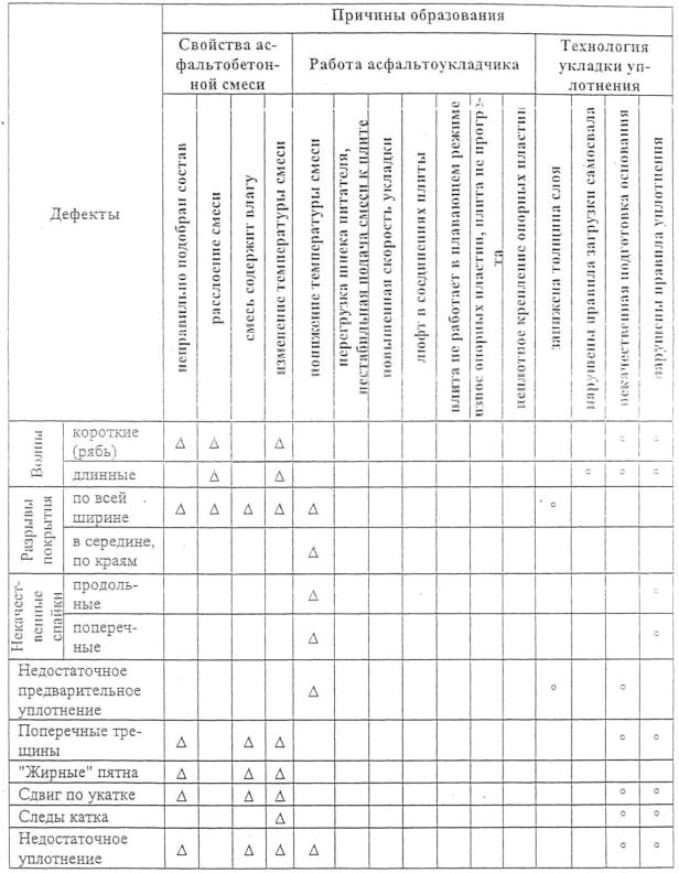 При резком повороте ведомого вальца возникают продольные трещины; а при изменении направления движения на одном и том же месте - наплывы или волнистая поверхность. Наплывы срезают лопатой, а покрытие с трещинами и наслоениями мелко насекают или разравнивают граблями и вновь укатывают. Если это не помогает, то заменяют верхнюю часть слоя на всю толщину горячей смесью, а затем уплотняют. Исправление дефектов после окончательной укатки требует больших затрат труда и не дает хорошего качества. В этом случае дефектные места очерчивают по контуру прямыми линиями, затем участок покрытия вырубают так, чтобы его края были вертикальными. Их смазывают разжиженным битумом, заполняют вырубленные участки доброкачественной смесью и укатывают. После нескольких проходов катка наплывы смеси на швах срезают, заглаживают райбовкой, а затем горячим утюгом и окончательно укатывают. Отремонтированные места более пористые и выделяются по цвету. Чтобы устранить это, заутюживают их края и обрабатывают поверхность тонким (0,2 мм) слоем разжиженного битума, который присыпают песком. "Жирные" пятна на покрытии появляются после розлива излишнего количества битума по нижележащему слою. При уплотнении битум поднимается. Такие места вырубают, очищают основание от ненужного битума и закладывают хорошую асфальтобетонную смесь. Ликвидировать излишки битума можно россыпью минерального порошка или чистого песка. 4.5 Ремонт с использованием литого асфальта и холодных органно-минеральных смесей.В соответствии с положениями действующих нормативных документов текущий ремонт с использованием литого асфальта типа V может производиться практически в течение всего года (при температуре до - 10 °С). Подготовительные работы выполняются в соответствии с положениями п. 4.2 за исключением операций по подгрунтовке. В зимний период в состав подготовительных работ включается очистка ремонтируемых карт от пескосоляного насоса, снега, льда, удаление воды. Транспортирование смеси к месту производства работ производится в специальных самоходных установках с котлом-термосом или бункером, оборудованных обогревом и мешалкой. При транспортировании должны обеспечиваться непрерывное перемешивание и температура смеси 180-240 °С, а в необходимых случаях - порционная выгрузка с варьированием скорости выдачи смеси. Перед началом загрузки котел-термос (бункер) прогревается в течение 10 мин. двумя подогревателями или форсункой до 180-190 °С. Крышка загрузочного отверстия должна быть открыта не ранее чем за 5 мин. до загрузки котла смесью. Запрещается включать сцепление привода мешалки перед запуском двигателя, а также привод мешалки до прогрева бункера и при наличии в нем остатков затвердевшей (не разогретой) смеси, препятствующей движению лопастей мешалки. В процессе транспортирования общее время перемешивания смеси в передвижной установке должно быть не менее 20 мин. Прибыв к месту укладки, самоходная установка устанавливается перед подготовленной картой с таким расчетом, чтобы выпускной лоток при наклоне котла (бункера) был направлен непосредственно в карту. Выгрузка смеси производится при наклоне выпускного лотка и одновременной работы лопастной мешалки в котле. Работы по распределению смеси с одновременной натяжкой на края карты и удалением излишков, а также заглаживан