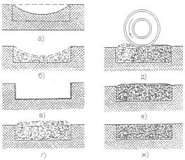 Рис. 4.18. Схема заделки выбоины холодной органо-минеральной смесью: а - разметка; б - обрубка выбоины по контуру; в - очистка карты; г - заполнение ремонтным материалом; д - прикатка уложенной смеси; е - покрытие после завершения ремонта; ж - покрытие в процессе эксплуатации. Движение на отремонтированном участке можно открывать сразу после прикатки. Окончательное формирование слоя органо-минеральной смеси происходит в процессе эксплуатации дорожного покрытия под воздействием транспортной нагрузки. Ремонт покрытий с использованием органо-минеральных смесей на участках разгона и торможения транспорта (перекрестки, остановки общественного транспорта) из-за особенностей формирования слоя может быть только временным мероприятием, например, аварийным ремонтом в дождливый или зимний периоды. Более длительный срок службы подобных карт (прямо пропорциональный интенсивности движения транспортных средств) отмечается на перегонных участках. За рубежом при текущем ремонте с использованием подобных материалов допускается их укладка непосредственно в выбоины (без подготовки карт) с минимальной глубиной, равной размеру крупного заполнителя. По результатам обследования отремонтированных участков на объектах федеральной дорожной сети установлено, что оптимальной следует считать толщину слоя в плотном теле, составляющую не менее двух диаметров крупного заполнителя. 4.6. Заделка трещинОсновным условием правильного назначения способа ремонта является определение причины образования трещины, степень разрушения материалов основания и покрытия, обоснованный выбор времени производства ремонтных работ и экономическая целесообразность затрат на выполнение ремонтных работ. Плановые работы по заделке температурных трещин целесообразно выполнять в периоды их максимального раскрытия. Наиболее оптимальные периоды - весенний при наступлении сухой и теплой погоды или поздней осенью, когда ночные заморозки вызывают сжатие асфальтобетона дорожного покрытия, но днем сравнительно тепло (не ниже +5 +10 °С). При заделке трещин кроме их герметизации должен быть создан "мягкий шарнир" из ремонтного материала между разделенными в горизонтальной плоскости слоями асфальтобетона. Поэтому в теплое время года, когда трещины раскрыты на меньшую ширину, рекомендуется их дополнительная разделка с образованием деформационной камеры (резервуара).
