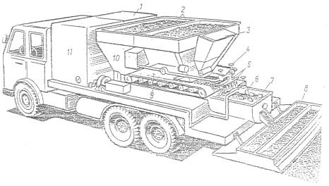Рис. 4.22. Передвижная установка для приготовления и распределения литых эмульсионно-минеральных смесей; 1 - резервуар для воды; 2 - бункеры для минеральных материалов; 3 - бункер для цемента; 4 - объемный дозатор присадок; 5 - система подачи воды и присадок, 6 - система подачи эмульсии; 7 - смесительное отделение; 8 - распределительная рампа; 9 - конвейер для подачи минеральных материалов; 10 - резервуар для присадок; 11 - резервуар для эмульсии. Бортовой камень, дождеприемные решетки и люки колодцев, уровень которых находится в нормативных пределах, перестановки не требуют. Непосредственно перед укладкой слоя производится ограждение участка, очистка и увлажнение (с расходом 0,5 л/м) его поверхности. Допускается укладка смеси при моросящем дожде с обеспечением водоотвода. Люки колодцев, решетки и деформационные швы должны быть перекрыты временными крышками. При повышенной скользкости покрытия (значение коэффициента сцепления менее 0,3) необходимо выполнить подгрунтовку с использованием битумной эмульсии. Рабочий цикл укладки защитного слоя включает следующие технологические операции (рис. 4.23): загрузка бункеров и емкостей машины компонентами ЛЭМС на притрассовом складе; переезд машины к месту производства работ; укладка защитного слоя на огражденном участке; переезд машины для загрузки на притрассовом складе.