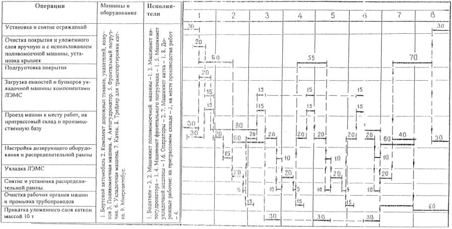 Рис. 4.23. Циклограмма выполнения производственного процесса по укладке защитного слоя из литой эмульсионно-минеральной смеси на сменной захватке 1000 м шириной 3,75 м (3750 м2). При необходимости сокращения временного интервала между укладкой слоя и открытием движения предусматривают его прикатку катком на пневмоходу массой до 10 т с целью отжатия воды при распаде эмульсии. Работы по укладке защитного слоя выполняет бригада в составе 7 человек: машинист укладочной машины 6 разряда - 1; помощники машиниста (операторы) 5-го разряда-2; дорожные рабочие: 5-го разряда-1; 4-го разряда-2; 3-го разряда-1. При необходимости в состав бригады включают машиниста катка 5-го разряда. Машинист управляет укладочной машиной, при необходимости, с использованием системы связи, выполняет указания оператора об изменении режимов подачи материалов и их смешения. Оператор с дорожным рабочим 5-го разряда регулирует положение распределительной рампы, визуально оценивает степень увлажнения уложенной смеси, в случае необходимости дополнительно ее увлажняет с помощью распылительного устройства. Дорожный рабочий 5-го разряда проверяет качество и равномерность распределения смеси, совместно с рабочими 3-го разряда устраняют выявленные дефекты, заделывают места сопряжения полос, перед последующими заправками машины очищают распределительную рампу. Дорожные рабочие 4-го разряда выполняют обязанности регулировщиков и находятся впереди распределительной машины. При загрузке распределительной машины в технологическом процессе участвуют машинисты фронтального погрузчика, поливомоечной машины, автогудронатора, а также дорожный рабочий 3-го разряда. В операциях по расстановке и снятию дорожных знаков и ограждений участвуют дорожные рабочие основной бригады (совместно с водителем бортового автомобиля). Распад уложенной смеси наступает когда частицы битума в эмульсии начинают соединяться друг с другом и каменным материалом, при этом коричневый цвет смеси сменяется на черный. Формирование слоя начинается при образовании битумной пленки на минеральном заполнителе и почти полном испарении воды. Окончательное обезвоживание уложенного материала, практически не влияющее на эксплуатационные свойства защитного слоя, может занять 2-4 недели. Полное формирование слоя, при котором допускается открытое движение, происходит (в зависимости от погодных условий) в дневное время за 0,5-2,0 часа. При работе в ночное время возможно закрытие участка с уложенным слоем до 4 часов. В процессе производства работ необходимо контролировать качество исходных материалов, смеси и уложенного слоя в соответствии с положениями ТУ 5718-001-53737504-00 [14]. Гранулометрический состав каменного материала и качество эмульсии необходимо определять каждую смену. При каждой заправке распределительной машины проверяется дозировочные устройства. Ровность и сцепные качества защитного слоя контролируют в соответствии с требованиями СНиП 3.06.03-85 [8] и ВСН 38-90 [19]. 5. Приемка работВ целях повышения ответственности подрядных организаций за качество выполняемых работ разработано и утверждено Правительством Москвы "Положение о критериях оценки качества и определения стоимости выполненных работ по текущему ремонту городских магистралей и улиц" [5]. В "Положении" установлены критерии оценки качества выполненных р