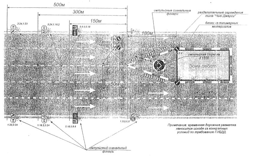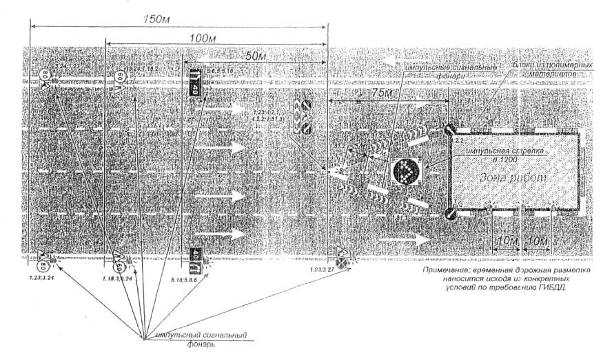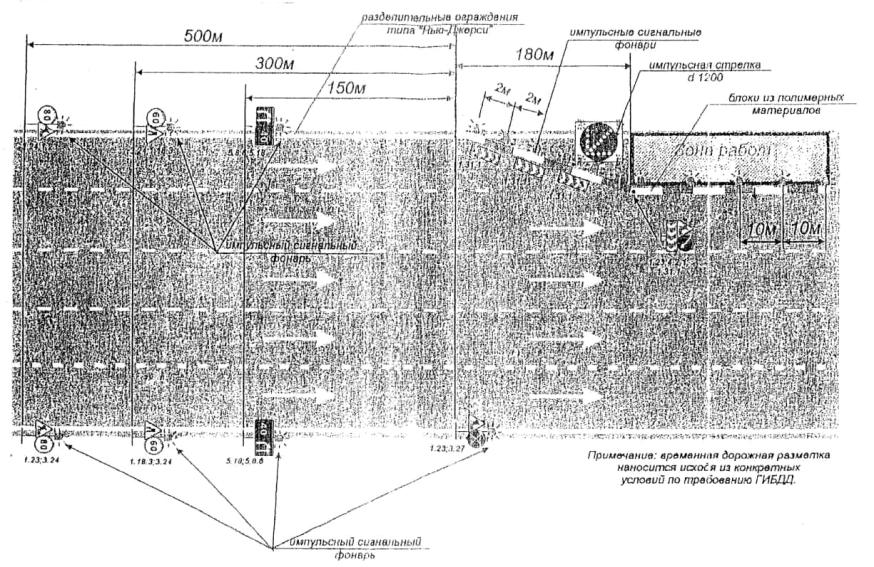 Рис. 6.3. Типовая схема оборудования места производства работ на МКАД при ремонте левой (крайней) полосы движения.