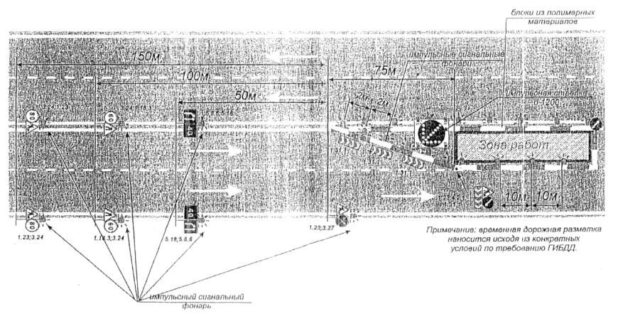 6. Техника безопасности и охрана труда при производстве ремонтных работ. Охрана окружающей средыК ремонтным работам допускаются лица, достигшие совершеннолетия, прошедшие медицинский осмотр, вводный (общий) инструктаж по технике безопасности и инструктаж по технике безопасности на рабочем месте (проводится также при переходе на другую работу и при изменении условий труда). Проведение инструктажа оформляется документально. После инструктажа не позднее одного месяца со дня поступления на строительство необходимо обучить рабочих по утвержденной программе безопасным методам работы. По окончании обучения организуется проверка знаний рабочих с выдачей им удостоверений. Проверка знаний проводится ежегодно. К работе на механизмах допускаются лица, имеющие удостоверение о прохождении техминимума и право на управление механизма. Дорожные рабочие обучаются безопасным приемам выполнения работ. В бытовых помещениях должна быть аптечка с медикаментами и средствами оказания первой помощи пострадавшим, а также бачок с питьевой водой. Во всех опасных в пожарном отношении местах должны быть установлены щиты с противопожарным инструментом. Запрещается курить и пользоваться открытым огнем при обращении с легковоспламеняющимися материалами и жидкостями. Перед началом работы следует проверить ручной инструмент, который должен иметь исправные рукоятки, гладкую поверхность и должен быть плотно насажен на металлические части. Конструкция механизированного ручного инструмента должна отвечать требованиям "Санитарных норм и правил при работе с инструментами, механизмами и оборудованием, создающими вибрацию, передаваемую на руки работающих, и по ограничению общей вибрации рабочих мест". Все работающие должны быть обеспечены спецодеждой (униформой) со светоотражающими вставками, спецобувью и другими средствами индивидуальной защиты. Работы на проезжей части могут производить только организации, имеющие необходимые технические средства обеспечения безопасности дорожного движения (дорожные знаки с улучшенными светотехническими характеристиками, импульсные дорожные стрелки, сигнальные фонари). Проведение работ на проезжей части без предварительного уведомления подразделений Управления ГИБДД не допускается. Для обеспечения безопасности производства работ на основных магистралях города подрядные организации в обязательном порядке подают заявки на выделение инспекторов подразделений Управления ГИБДД. Расстановку дорожных знаков и ограждение мест работ выполняют в соответствии с типовыми схемами, утвержденными Правительством Москвы (рис. 6.1-6.5). Средства организации дорожного движения, расположенные ранее на участке, где будут производиться дорожные работы, должны быть сняты или зашторены, если они противоречат временной схеме организации движения, принятой на период производства работ. Установка временных дорожных знаков и ограждений, а также выполнение других мероприятий производятся силами и средствами организации, производящей работу. Дорожные знаки, устанавливаемые в зоне производства работ, должны иметь внешнее или внутреннее освещение или световозвращающую поверхность и соответствовать требованиям ГОСТ 10807-78. Знаки со световозвращающей поверхностью должны применяться на участках дорог без стацион