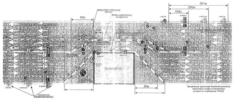 Рис. 6.2. Типовая схема оборудования места производства работ в городских условиях при ремонте средних полос движения.