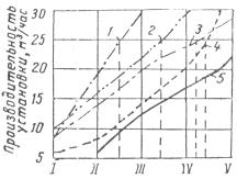 Рис. 1. График зависимости производительности дозаторов от положений стрелки вариаторов: 1 - вода; 2 - щебень фракции 5-20 мм; 3 - щебень фракции 20-40 мм; 4 - песок; 5 - цемент Этот график действителен при работе установки на постоянных материалах, составляющих бетонную смесь. Для изменения производительности дозаторов необходимо изменить вариатором передаточное отношение. Для этого устанавливают стрелки вариатора (только на ходу) на соответствующее деление по приближенной кривой и последующей тарировкой вносят необходимую поправку в их положение. Исправность работы дозаторов проверяется ежедневно в начале смены представителем лаборатории ЦБЗ. Весовое устройство устанавливается в соответствии с утвержденным главным инженером строительного управления составом бетонной смеси и учетом влажности заполнителей. Доступ к весовым шкафам и дозировочным устройствам, а также изменения количества материалов разрешается производить только работникам лаборатории. Составляющие бетонной смеси немедленно после поступления на бетонный завод подвергаются контролю лабораторией ЦБЗ и Центральной лабораторией строительного управления. Качество материалов проверяют внешним осмотром и путем отбора проб. Завод работает по схеме, данной на рис. 2.