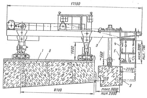 Схема навесного монтажа пролетных строений при помощи монтажного крана СПК-65: 1 - часть монтируемого пролетного строения; 2 - поданный под монтаж блок; 3 - кран СПК-65; 4 - люлька крана; 5 - домкратная установка для натяжения тросовой арматуры; 6 - подкрановый путь е) закончена оборка плашкоута для подачи блоков под монтаж; к) завершен монтаж перегрузочного крана для погрузки и разгрузки готовых блоков. Консольную часть пролетного строения /кроме первого опорного блока/ собирают из коробчатых блоков весом до 50 т на клееных стыках. Склеивание производится клеем на основе эпоксидной смолы. Клей в шве выполняет 3 функции: - прочно соединяет блоки; - изолирует стык; - равномерно распределяет нормальные напряжения по торцам блоков. Навесной монтаж начинается с блока, который сопрягается с собранной на сплошных подмостях частью пролетного строения. Первый блок консольной части соединяется с анкерной частью пролетного строения при помощи "мокрого" стыка, так как от правильности и точности установки этого блока зависит положение всех блоков консоли в плане и профиле. К моменту доставки блоков на монтаж, консольный кран должен находиться в исходном положении. Строповка блоков производится в двух точках гибкими стропами, пропущенными в отверстия верхней плиты блока. После подъема блок соединяют насухо с ранее смонтированным и притягивают с помощью фиксаторов, после чего проверяют качество совпадения стыкуемых поверхностей блока для определения толщины освобождают от строп монтажного крана и производят подготовительные работы по натяжению рабочей арматуры. Контроль прочности сцепления клея с поверхностью бетона стыкуемых блоков производят двумя способами: а) отбором проб (отколов) натеков клея и изломом их после 5-10 мин прогрева в сжатой руке /полимеризованный клей имеет хрупкий излом, клей не полимеризованный после прогрева в руке тягуч и ломается лишь при значительном перегибе пробы; б) испытанием пробных образцов на прочность, т.е. испытанием составных призм, склеенных из трех кубиков размером 10×10×10 см, путем выдавливания среднего кубика /при испытании по этому способу качество склеивания может считаться хорошим, если разрушение при срезе происходит по бетону/. Каждый блок консольной части пролетного строения притягивается двумя петлевыми канатами диаметром 48 мм, расположенными по верхней плите блоков. Каждая ветвь каната с помощью натяжного устройства /двумя гидравлическими домкратами по 100-200 т в каждом конце каната/ натягивается усилием 102,1 т. Канаты крепятся серединой в петлевых упорах, закладываемых в блоках при изготовлении. Концы канатов с залитыми муфтами пропускаются через каналы в монтируемом блоке и анкеруются вилкообразными шайбами. На этой монтаж блока заканчивается и монтажный кран перемещают па следующую стоянку. Одновременно с работами по наращиванию подкранового пути снимают монтажные арматурные пучки, с помощью которых производилось обжатие стыка. Б. Приготовление эпоксидного клея Клей на основе эпоксидной смолы является абсолютно водостойким, морозостойким и представляет собою вязкую массу. Приготовление клея сводится к тщательному перемешиванию смолы ЭД-5 с остальными компонентами, которые должны дозироваться строго по весу. Выбор состава клея по требованиям технологической жизнеспособности /пром