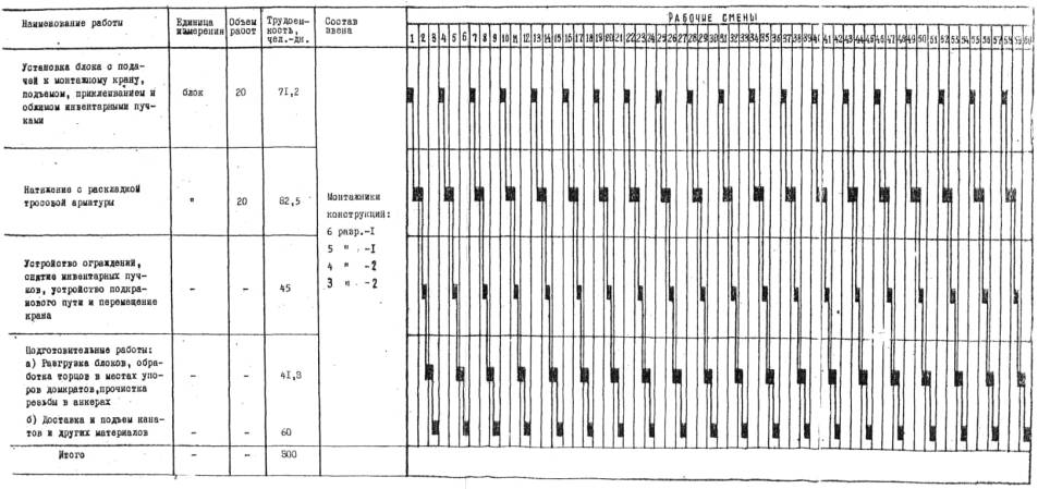 Примечание. Эти же составы клеев можно применять и в зимних условиях строительства, приняв меры для прогрева бетона в зоне шва с помощью электрокалориферов, газовых и электрических генераторов инфракрасного излучения и других способов электропрогрева. Расход клея на склеивание 1 м2 поверхности бетона составляет 1,6-1,7 кг. В. Указания по применению эпоксидного клея Клей на эпоксидных смолах является веществом, обладающим токсическим действием, могущим при небрежном и неправильное с ним обращении вызвать отравление, рвоту, кожные болезни, поэтому обращение с ним требует особой осторожности. При производстве работ с эпоксидными смолами и их отвердителями следует брать для работы минимальное количество материалов /необходимых на рабочий, день/смену/, или на выполнение разового задания/. Сбор загрязненных: клеем бумаг, тканей и других материалов производится в рабочей зоне в металлические емкости, а сжигание этих отходов - в специально отведенных для этого местах. Клей должен приготавливаться в укрытом от солнца, хорошо проветриваемом помещении, с гладким полом, покрытым бумагой. После каждого разведения клея использованную бумагу сжигают. Клей и составляющие его материалы должны переноситься в бачках, оборудованных ручками для переноски, в соответствии с правилами переноски кислот. Нанесение клея на бетонную поверхность следует производить только в спецодежде и со специальных подмостей. Кисти, шпатели, щетки и другие приспособления должны быть снабжены специальными предохранительными картонными конусами, не допускающими затекания клея на руки. После окончания работ с клеем руки следует вымыть горячей водой с мылом и содой, а инструмент ацетоном. Клей с эпоксидными смолами являемся веществом опасным в пожарном отношении, поэтому в местах приготовления, разведения и нанесения клея, а также в местах хранения составляющих компонентов клея курение, разведение огня, электросварка, а также сжигание остатков запрещается. Места работы с клеем должны быть обеспечены средствами пожаротушения - огнетушителями, водой, баграми и песком. Все работы с клеем должны выполняться в соответствии с "Санитарными правилами при работе с эпоксидными смолами" № 348-60, утвержденными Главной санитарной инспекцией СССР 27/ХII-1960. 2. Указания по организации трудаВсе работы по навесному монтажу выполняет комплексная бригада в составе 15 чел. в 3 смены - по 6 чел. в первую и вторую смены и 3 чел. в третью смену. Наиболее ответственные работы /подъем и склеивание блоков с обжатием швов/ выполняются в светлое время суток. Бригада укомплектовывается из монтажников стальных и железобетонных конструкций, владеющих смежными профессиям бетонщиков, арматурщиков и плотников. В состав бригады включаются монтажники, владеющие профессиями газоэлектросварщиков. Все рабочие бригады должны уметь выполнять основные операции: строповку блоков, раскатку и натяжение канатов, приготовление и нанесение эпоксидного клея. Как правило, отдельные рабочие процессы выполняются постоянными исполнителями, но могут выполняться и рабочими, имеющими смежную специальность. Рабочей зоной для рабочих смены является место монтажа пролетного строения /у монтажного крана/, где производятся основные работы по навесному монтажу. По мере продвижения монтажа консольной части пролетно