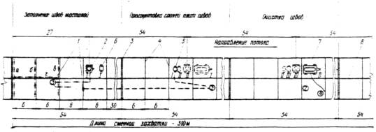 Примечание. Цифра над линией - длина участка в м Цифра под линией - продолжительность операции в минутах ↓ - рекомендуемое время для принятия пищи 5. График заполнения температурных швов тиоколовым герметикой на захватке длиной 310 м (700 м швов)