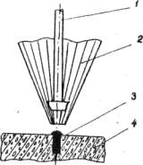 Рис.2. Конусная лейка для заливки мастикой в швах цементно-бетонного покрытия: 1 - шток с пробкой; 2 - корпус лейки; 3 - залитый шов; 4 - бетонная плита покрытия После того, как мастика в шве застывает, ее излишки и наплывы срезают лопаточкой и загружают в котел для повторного применения. Формирование мастики в шве длится 2-4 недели. В сухую и жаркую погоду, когда дню заливки швов предшествовали не менее трех дней с температурой воздуха не ниже + 25 °С можно заливать мастику без прогрунтовки стенок швов. Чтобы исключить ожидание выдержки грунтовки в течение 2-3 ч, в процессе работы периодически прогрунтовывают швы, поддерживая необходимую величину задела (примерно 50-80 м покрытия). В процессе работы по мере расходования мастики загружают котел брикетами мастики, следят за ее температурой, а также перемещают битумные котлы по участку работ. В конце работы топки в котлах должны быть погашены, а конусные лейки или заливщик швов - промыты бензином. Заполнение швов тиоколовым герметиком Тиоколовый герметик, изготавливаемый на основе синтетического каучука (тиокола), представляет собой вязкую пасту, способную после вулканизации превращаться в резиноподобную эластичную массу. Этот герметик применяют для заполнения температурных швов бетонных покрытий на дорогих I-III категорий, а также в районах с суровыми климатическими условиями (устойчивая минимальная температура воздуха в зимний период ниже - 25 °С). Тиоколовый герметик рекомендуется также для заливки швов в бетонных покрытиях аэродромов. Приготовление тиоколового герметика и заполнение швов производят комплектом машин конструкции СоюздорНИИ, состоящем из мешалки и двух заливщиков швов. Приготовление тиоколового герметика Тиоколовый герметик приготовляют на месте работ непосредственно перед заполнением швов путем онемения в холодном состоянии герметизирующей и отверждающей пасты, поставляемых заводами химической промышленности. Герметизирующая паста сметанообразной консистенции, черного цвета поступает в алюминиевых баках емкостью 50 л. Отвергающая паста - густая, темно-серого цвета поступает в баках емкостью 50 л перед употреблением ее разводят небольшим количеством воды (5-7 %) и тщательно перевешивают. Пасты загружают в заливщик емкостью 45 л (герметизирующей пасты - 100 и отверждающей пасты - 20 весовых частей). Затем вращают вручную или электромотором мешалку принудительного действия, вставляемую в заливщик до загрузки материалов. При механическом перемешивании в комплект необходимо включать передвижную электростанцию ЖЭС-4,5. Смесь перемешивают до получения однородной по цвету и консистенции пасты. После этого мешалку вынимают из заливщика и устанавливают во второй заливщик. Приготовленная паста пригодна для употребления в течение 6-3 ч. Заполнение швов После очистки паза шва для обеспечения прочного оцепления герметика с бетоном торцевые грани бетонных плит протирают ацетоном и подсушивают сжатым воздухом. При наполнении швов тиоколовым герметиком грани швов не грунтуют. Перед заполнением шва герметиком в него закладывают хлопчатобумажный шнур, а полосы бетонной поверхности, прилегающие к очищенному шву, посыпают тонким слоем минерального порошка, для чего предварительно на шов накладывают веревку диаметром большим ширины шва в 1,5-2 раза. Затем веревку убирают и зап