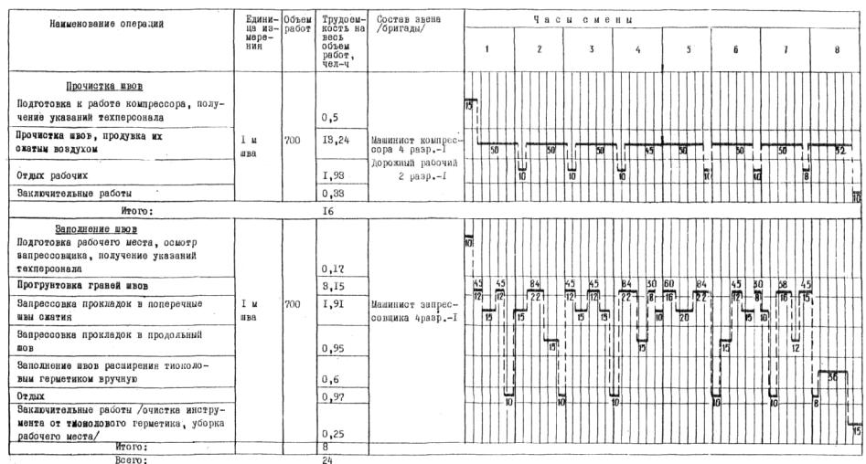 Машинист запрессовщика 4 разр. обмазывает грани швов разжиженным тиоколовым герметиком, заправляет в запрессовщик неопреновую прокладку, запрессовывает ее в шов, исправляет неровности стальной лопаточкой и перемещает машину к следующему шву. Он же обслуживает электростанцию ЖЭС-4,5. Машинист компрессора 4 разр. и дорожный рабочий 2 разр. прочищают швы крючками, прикрепленными к штуцерам воздуховодов и одновременно продувают швы сжатым воздухом, а также прочищают швы стальными щетками. 4. График заполнения температурных швов неопреновыми прокладками на захватке длиной 310 м (700 м швов)