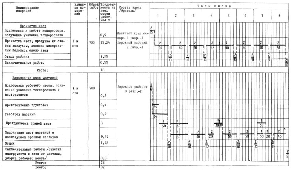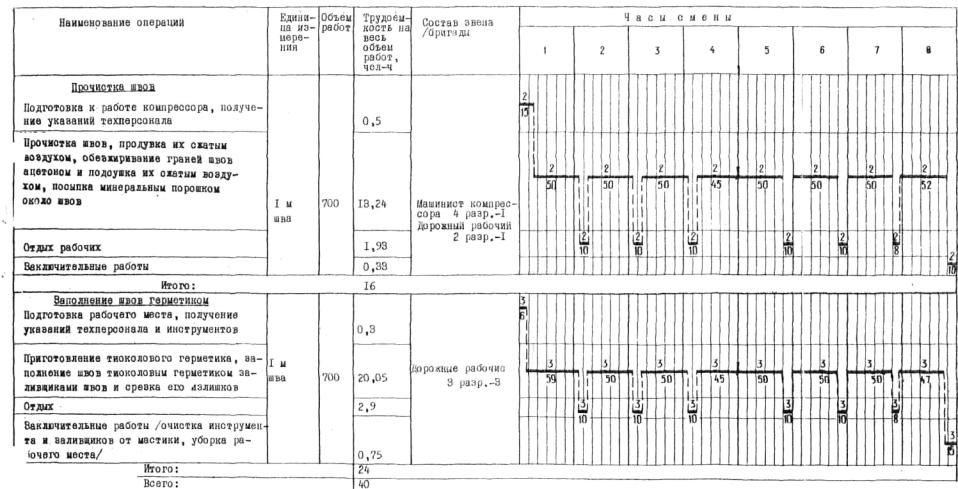 Машинист компрессора 4 разр. обеспечивает подачу сжатого, воздуха, прочищает швы крючком, прикрепленным к штуцеру воздуховода, с одновременной продувкой швов сжатым воздухом. Дорожный рабочий 2 разр. очищает швы стальной щеткой, закладывает в них хлопчатобумажный шнур и посыпает покрытие около швов минеральным порошком. Два дорожных рабочих 3 разр. разогревают в котле битумно-битумно-полимерной мастики и готовят жидкий битум, а затем грунтуют грани швов и заливают швы мастикой, применяя конусные лейки на тележке. После остывания мастики они срезают шпателем наплывы, собирают их и загружают в котел с мастикой, а по мере ее расходования загружают в котел брикеты мастики. Все оборудование и механизмы в течение смены имеют 6 стоянок через 54 м (между швами расширения). б) Заполнение швов тиоколовыми герметиками