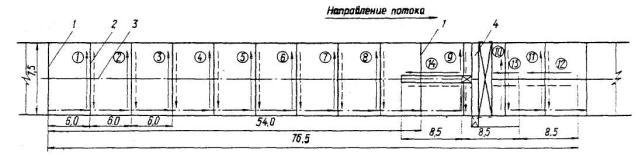 Рис. 5. Технологическая схема нарезки температурных швов в затвердевшем цементно-бетонном покрытии модернизированным нарезчиком Д-432А с алмазными дисками: 1 - шов расширения; 2 - поперечный шов сжатия; 3 - продольный шов; 4 - агрегат для нарезки температурных швов с применением модернизированного нарезчика Д-432 А. Цифрами в кружках обозначена последовательность нарезки пазов швов