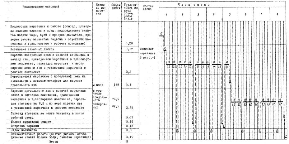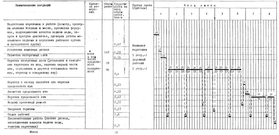 цементно-бетонных дорожных покрытиях» В модернизированном нарезчике Д-432 А должны быть установлены оградительные щитки дисков и приводных ремней. III. Указания по организации трудаРаботы по нарезке температурных швов в затвердевшем цементно-бетонном покрытии выполняют, как правило, в две смены. Для успешного выполнения работ на участок заранее должны быть доставлены все необходимые материалы. Технологическая карта, предусматривает установку вагончика для отдыха рабочих и приема пищи, бачка с питьевой водой, аптечки, средств для ограждения участка работы, ларя для хранения инструментов, стального сейфа для хранения запасных алмазных дисков. а) Нарезка температурных швов нарезчиком Д-903 /Д-510/ (при длине сменной захватки 78 м цементно-бетонного покрытия или 168 м швов) Состав звена: Машинист нарезчика 5 разр. - 1 Дорожный рабочий 2 разр - 1 Все операции по нарезке швов выполняет машинист 5 разр., получивший соответствующую подготовку и инструктаж, знающий устройство нарезчика, правила обращения, управления, ухода и эксплуатации. В течение смены машинист проверяет наличие и затяжку болтов, надежность стопорных устройств крепежа, смазку отдельных деталей нарезчика, а также его заправку горючим. Дорожный рабочий 2 разр. размечает швы вместе с машинистом нарезчика; при уходе за бетоном битумной эмульсией подсыпает песок под колеса нарезчика, при засыпке песком - очищает от песка места работы нарезчика. По мере передвижения нарезчика или цистерны с водой он переносит шланг подачи воды к нарезчику, в необходимых случаях помогает машинисту устанавливать нарезчик на шов, в процессе нарезки шва периодически контролирует положение указателя курса нарезчика. По окончании работы машинист и дорожный рабочий снимают диски, отсоединяют шланг подачи воды, очищают нарезчик. б) Нарезка температурных швов модернизированным нарезчиком Д-432 А (при длине сменной захватки 76,5 м, цементно-бетонного покрытия или 159 м швов) Состав звена: Машинист нарезчика 5 разр.-1 . Все работы по нарезке температурных швов модернизированным нарезчиком Д-432 А осуществляет машинист нарезчика 5 разр. Машинист кроме знаний и прав управления нарезчиком должен иметь права на работу с электростанцией, а также должен быть обучен работе с подъемным тельфером. Кроме операций, указанных в разделе "Указания по технологии производственного процесса машинист управляет работой электростанции, установленной на самоходном мостике агрегата, контролирует качество нарезки швов, следя за их прямолинейностью и глубиной, подносит шланг подачи воды к нарезчику, следит за выполнением требований и правил техники безопасности. В течение смены машинист производит мелкий крепежный ремонт и смазку отдельных деталей нарезчика, а также заправку двигателя горючим и емкостей водой. По окончании смены машинист снимает и убирает диски и очищает нарезчик. IV. А. График производственного процесса по нарезке швов нарезчиком Д-903 с алмазными дисками на захватке 168 м швов или 78 м цементно-бетонного покрытия