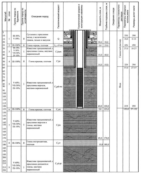 При бурении скважины применяется способ одноступенчатого цементирования с применением двух разделительных пробок. Цементация ведётся портландцементом с помощью цементосмесительных машин и цементировочных агрегатов типа 1АС-20 и 3АС-30. Для закачивания и продавливания цементного раствора используются специальные цементировочные агрегаты типа ЦА-1,4-1-150. Обеспечение электроэнергией осуществляется от существующих сетей, вода - привозная. При наличии вблизи участка работ источника водоснабжения (водоток, пруд, шахтный колодец, скважина на четвертичный горизонт и пр.) для обеспечения водой технологического процесса бурения необходимо предусмотреть прокладку временного водопровода от источника до места производства работ. Интервал 0-10 м проходится долотом (шарошечным расширителем) Æ 590 мм с последующей установкой направляющей колонны Æ 530 мм. Затрубное пространство колонны цементируется от башмака до устья. Цементная пробка разбуривается долотом Æ 490 мм. До глубины 27,0 м бурение осуществляется трехшарошечным долотом Æ 490 мм, затем пройденный интервал крепится колонной обсадных труб Æ 426 мм. Затрубное пространство колонны цементируется от башмака до устья. Цементная пробка разбуривается долотом Æ 395 мм. После проведения цементировочных работ производится испытание обсадных колонн на герметичность, путем создания внутреннего избыточного давления. До глубины 57,0 м бурение осуществляется трехшарошечным долотом Æ 395 мм, затем пройденный интервал крепится колонной обсадных труб Æ 324 мм. Затрубное пространство колонны цементируется от башмака до устья. Цементная пробка разбуривается долотом Æ 295 мм. После проведения цементировочных работ производится испытание обсадных колонн на герметичность, путем создания внутреннего избыточного давления. До проектной глубины 122,0 м скважина бурится трехшарошечным долотом Æ 295 мм с промывкой чистой водой. Далее в скважину, с выводом на поверхность, устанавливается фильтровая колонна Æ 219 мм. Фильтр имеет надфильтровую часть, рабочую фильтровую часть и отстойник. Конструкции фильтровой колонны (положение рабочих и глухих частей) уточняются по фактическому разрезу. Скважина промывается чистой водой (кратковременная прокачка эрлифтом или погружным насосом), после чего в ней проводится опытная откачка с обязательным отбором проб воды для определения физико-химического и бактериологического состава воды. Порядок производства работ и спецификация материалов. Типовая конструкция (2-3) Порядок производства работ Конструкция скважины глубиной 122 м разработана для вращательно-роторного способа бурения установкой типа 1БА-15В. Эксплуатируемый водоносный горизонт: подольско-мячковский среднего карбона (С2 pd-mc). Проходка пород осуществляется с применением коллоидального глинистого раствора в интервале 0-57 м, бурение в интервале 57-122 м ведется с промывкой чистой водой. Производится цементация колонн труб Æ 530, 426 и 324 мм с подъемом цементного раствора от башмака до устья скважины. Для уточнения геологического разреза и наиболее водоприточных зон в скважине проводятся геофизические работы в составе замеров ПС, КС под каждую колонну, гамма-каротажа (по всему стволу скважины), кавернометрии, резистивиметрии. Фильтровая колонна Æ 219 мм устанавливается от 0 до 122 м с перфорацией на уровне водоносных по
