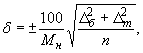 При Мн свыше 20 до 25 т включительно d составляет ±5%; свыше 25 до 32 т включительно: ± 4%; свыше 32 до 45 т включительно: ± 3%; свыше 45 до 64 т включительно: ± 2%; свыше 64 до 90 т включительно: ± 1,5%; свыше 90 до 124 т включительно: ± 1%; свыше 124 до 140 т включительно: ± 0,8%. Пример - Результат взвешивания Мб = 84,85 т получен на вагонных весах. Согласно значению, указанному на трафарете вагона, Мт = 22,05 т, Мн = 84,85 - 22,05 = 62,80 т Погрешность определения Мн находят одним из двух способов: а) исходя из приведенных в 7.1.4 данных d: не более 2 %; б) по формуле (4):