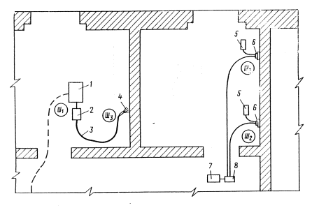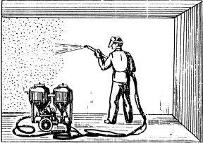 1. Емкость для приема готовой смеси. 2. Материальный шланг диам. 38 мм. 3. Затаренная в мешки известково-песчаная смесь. 4. Емкость для хранении шпатлевки. 5. Емкость для гашения известково-песчаной смеси, 6. Установка этажная УЭС-71 с растворонасосом 3.2.4. При производстве работ по схеме 4 (пневматический способ) поданный на этаж раствор заливают через металлическую сетку с ячейкой 0,3-0,4 мм в двухбачковый шпатлевочный агрегат СО-21. Затем подается сжатый воздух от компрессора СО-7А в один из бачков агрегата. За счет избыточного давления смесь поступает по материальному резиновому шлангу в модернизированную удочку Кораблева с материальной трубкой внутренним диаметром 18 мм и выходным отверстием головки 6-8 мм. Схема 3 Механизированное бескомпрессорное нанесение и затирка накрывочного слоя