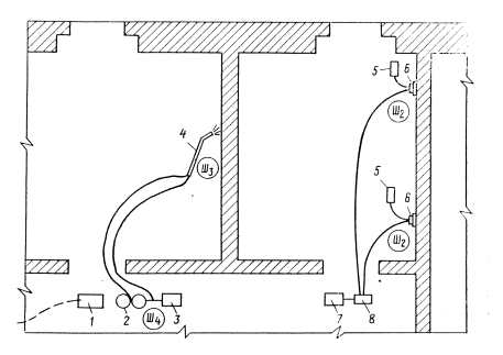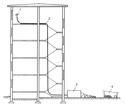 1. Форсунка бескомпрессорного распыления, конструкции Мособлоргтехстроя, или прямоточная. 2. Материальный шланг диам. 38 мм. 3. штукатурная станция ПШУ-1. 4. Склад для храпения известково-песчаной смеси и шпатлевки. 3.1.3. При выполнении небольших объемов работ приготовление и подача накрывочной смеси осуществляется по схеме 2. В этом случае применяется установка этажная УЭС-71 с растворонасосом. 3.2. Механизированное нанесение накрывочного штукатурного слоя из приготовленного известково-песчаного раствора. 3.2.1. Накрывочный слой из раствора, приготовленного на основе сухой смеси и шпатлевочного состава, наносится толщиной 2-3 мм но выровненному грунту после его схватывания. 3.2.2. Производство работ осуществляется по технологическим схемам 3 и 4. 3.2.3. В соответствии со схемой 3 нанесение смеси осуществляется бескомпрессорными форсунками с использованием растворонасоса, установленного на этаже, или штукатурной станции ПШУ-1, находящейся около отделываемого здания. Схема 2Механизированное приготовление и подача накрывочной смеси (раствора) к рабочим местам штукатуров