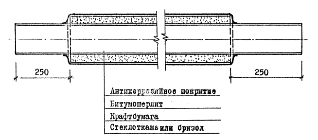 Для изоляции стыков на прямых участках трубопровода. УКАЗАНИЯ ПО ПРОИЗВОДСТВУ РАБОТ Изоляцию сварных стыков разрешается производить после опрессовки трубопроводов теплосети. Перед устройством битумоперлитовой изоляции стыка сварной шов и металлическая труба должны быть очищены от грязи, ржавчины и окалины, а затем окрашены праймером. Тепловая изоляция стыков теплопроводов выполняется битумоперлитовыми скорлупами. Битумоперлитовая изоляция стыков должна быть прочной, сплошной и плотно прилегать к металлической трубе и торцевым поверхностям заводской изоляции. После устройства тепловой изоляции стыка поверх неё должны быть наклеены два слоя стеклоткани по горячему битуму БН-IV или мастике БЛК. Обертывание стыка стеклотканью осуществляется следующим образом: поверхность битумоперлита должна быть загрунтована горячим битумом БН-IV или мастикой БЛК; лента стеклоткани шириной 25 - 35 см наматывается по винтовой линии с натяжением, обеспечивающим её плотное прилегание к изолируемой поверхности, и с нахлестом на половину ширины ленты так, чтобы за одни проход получалась двухслойная оклейка; сверху стеклоткань должна быть вновь окрашена горячим битумом или мастикой БЛК. Наклеенная стеклоткань должна иметь напуск 15 - 20 см на примыкающие участки трубопровода с заводской изоляцией. Температура горячего битума должна быть не ниже 180°С, а мастики БЛК не ниже 70°С. Битумоперлитовые скорлупы поставляются с завода вместе с изолированными трубами. При установке на место они должны быть подогнаны по размерам (скорлупы хорошо режутся ножовкой), а внутренние и торцевые поверхности их должны быть приклеены на горячем битуме. Закрепление скорлуп на стыке осуществляется с помощью двух-трех скруток из отожженной вязальной проволоки. Зазоры между скорлупами и заводской изоляцией должны заливаться горячим битумом. После этого производят наклейку двух слоев стеклоткани.