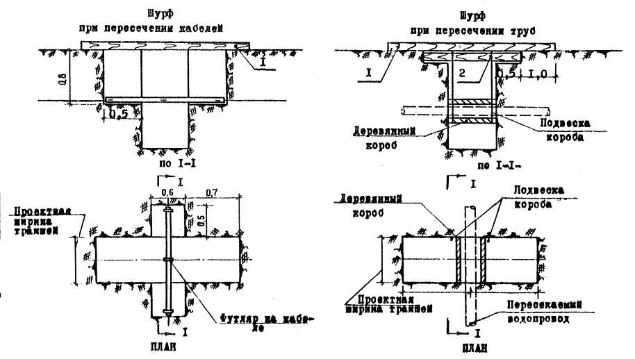 1 - инвентарный щит для перекрытия шурфа 2 - брус для подвески короба» УКАЗАНИЯ ПО ПРОИЗВОДСТВУ РАБОТ До начала разработки грунта механизмами все подземные коммуникации (эл. кабели, кабели связи, водопровод, газопровод и т.д.), расположенные выше отметок теплотрассы, должны быть вскрыты шурфами. Шурфы разрабатываются до проектной отметки дна траншеи и ограждения инвентарными щитами. Наиболее ответственной разработкой является вскрытие мест пересечения теплосети с электрическими кабелями и кабелями связи. При выполнении этих работ запрещается применять металлические лопаты, ломы, кирки и т.д., а разработку шурфа необходимо вести деревянной лопатой с окантовкой режущей кромки металлом. Кабели, вскрытые шурфами, должны быть заключены в металлический футляр покрывающий траншею по 0,5 м в каждую сторону. В случае разработок шурфов большой ширины (более 1,0 м) в местах пересечения теплосети с трубопроводами, расположенными выше отметок её заложения, трубы необходимо заключить в деревянный короб и подвесить к перекладине. Размер и материал перекладин определяется в зависимости от ширины траншеи и вида подвешиваемых коммуникаций. Разборка подвесок производится только после засыпки траншей до низа короба. После разборки короба грунт под сооружением должен быть хорошо утрамбован.