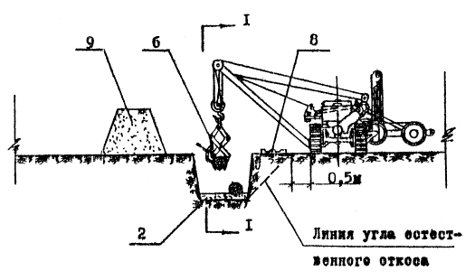 ОБОЗНАЧЕНИЕ 1 - бровка траншей; 2 - песчаная подушка; 3 - приямок; 4 - уложенные трубы; 5 - трубоукладчик; 6 - мягкий клещевой захват для труб или траверса с двумя мягкими "полотенцами"; 7 - укладываемая труба; 8 - лежки под трубы; 9 - отвал грунта. ПРИМЕЧАНИЕ Для труб диаметром до 219 мм длиной 6 - 12 м применять трубоукладчик марки ТЛ-ДТ-54А. Для труб диаметром свыше 219 мм длиной 6 - 12 м применят» трубоукладчик марки ТЛ-4. РАЗРЕЗ II - II